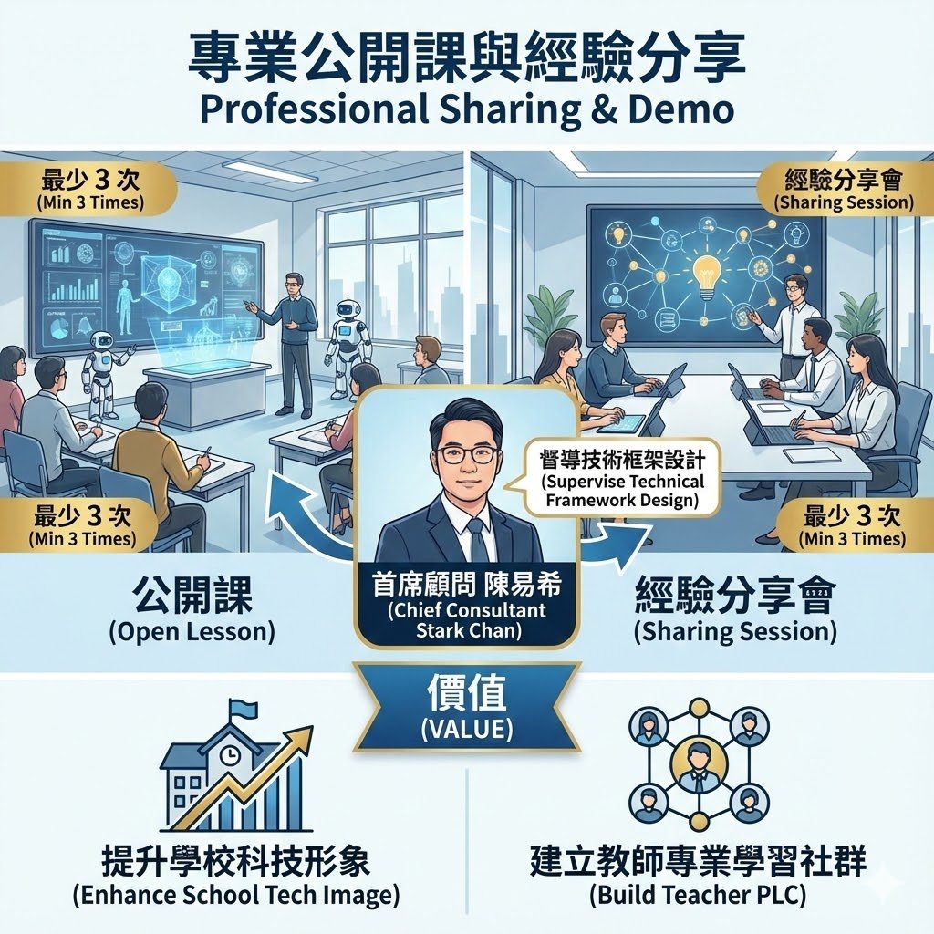 籌辦最少 3 次公開課及 3 次經驗分享會 。方案由首席顧問 陳易希 (Stark Chan) 親自督導示範課的技術框架設計,將前沿的創科思維轉化為可落實的教學演示範例 。